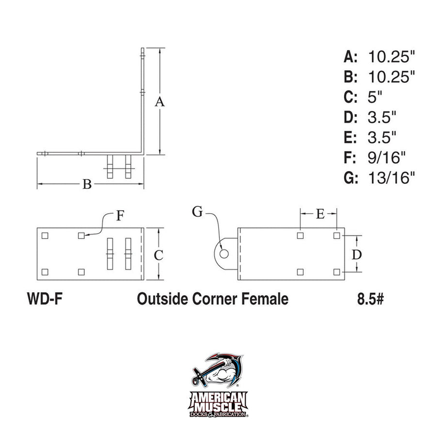 Dock Connector with Dual 2.5" Attachment Tabs - Compatible with WD-M & WD-TM: This robust dock connector features two sturdy 2.5-inch tabs, designed for secure attachment using a 3/4-inch pin or bolt (not included). Specifically engineered for use with our Outside Corner Male (WD-M) and Single T Male (WD-TM) connectors, this component provides a strong and reliable connection point for your dock system.