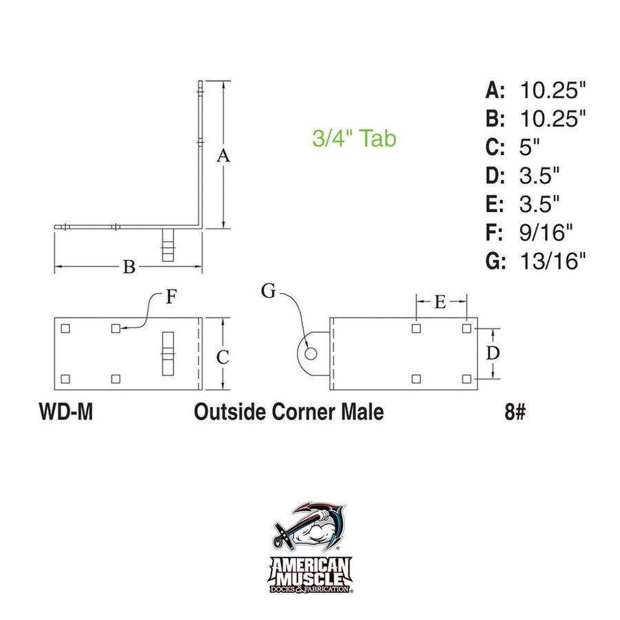 This durable dock connector features a single, sturdy 1.75-inch tab, pre-drilled to accept a 3/4-inch pin or bolt (not included) for secure fastening. Specifically designed for use with our Outside Corner Female (WD-F) and Single T Female (WD-TF) connectors, this component provides a reliable connection point for your dock system.