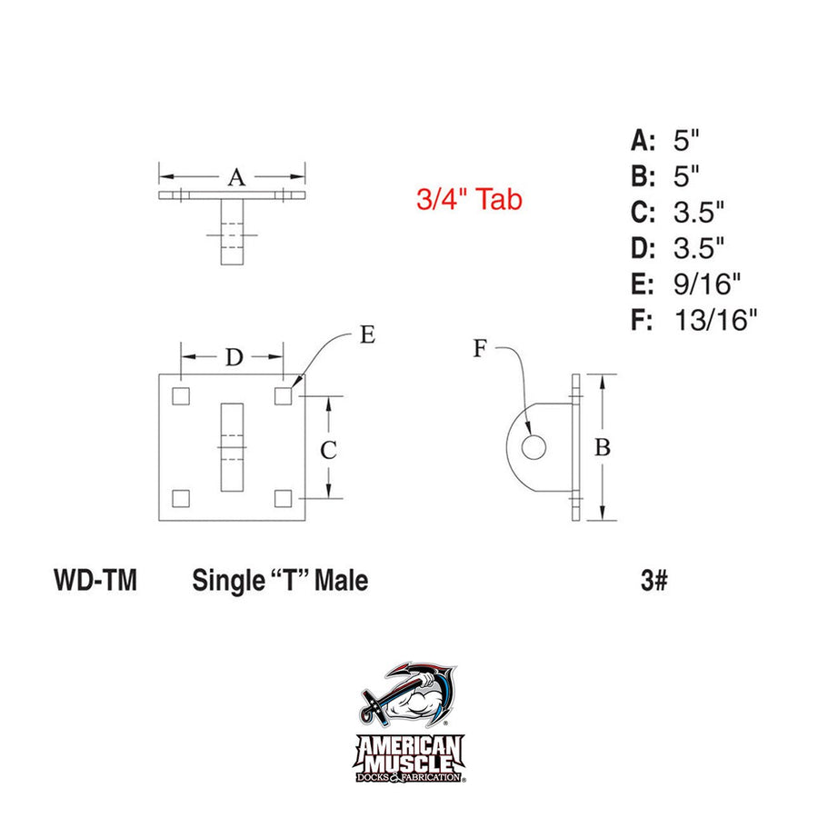 The WD-TM is a durable dock connector featuring a single 3/4-inch attachment tab, pre-drilled to accept a standard 3/4-inch pin or bolt (not included). This connector is specifically designed for secure and reliable connections with Outside Corner Female (WD-F) and Single T Female (WD-TF) dock hardware.