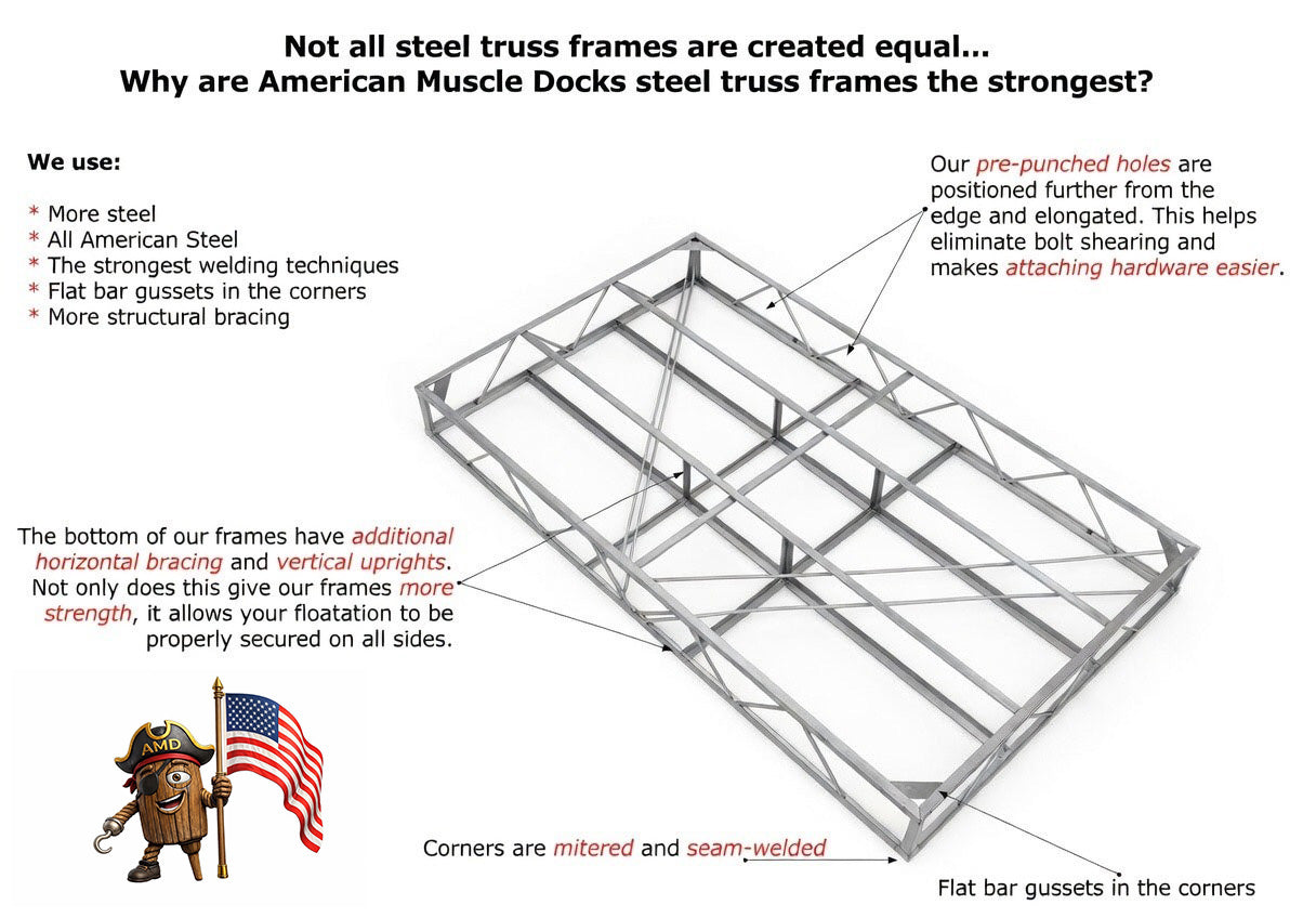 Engineered for exceptional strength and longevity, American Muscle Docks steel truss frames are constructed from sturdy 1.5" x 1.5" x 3/16" steel angle, strategically separated by 1/2" diagonal round bar to create a highly rigid box frame structure. For added reinforcement, corner gussets are incorporated at all four top corners.