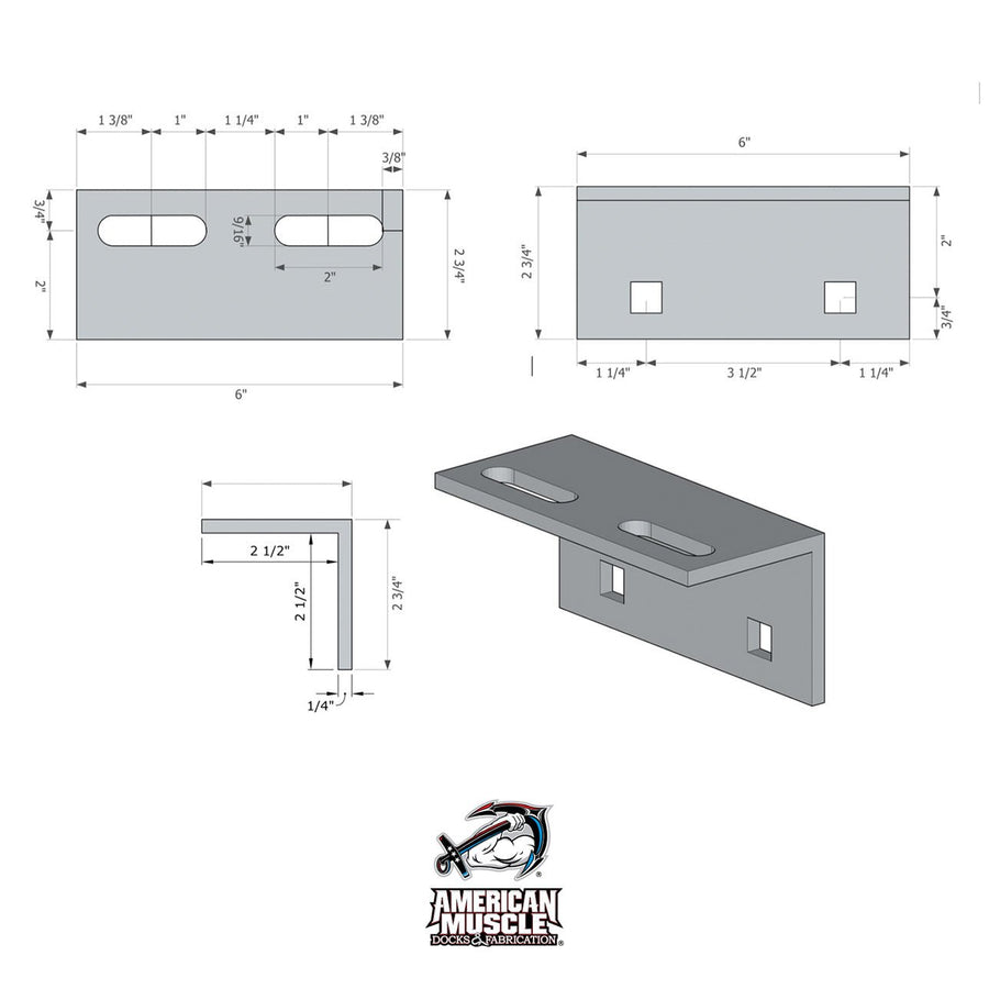 This heavy-duty XL Cleat Angle bracket is specifically designed for securely mounting dock cleats larger than 12 inches. Bolted to the inside of the side stringer and reinforced with a WD-W Washer Plate (used as a backup), this assembly ensures your large cleat is firmly attached to the dock's framing, not just the deck board. The slotted holes accommodate a range of cleat sizes. We also offer a standard Cleat Angle for smaller cleats.